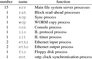 The structure of the file system server is a set of kernel processes synchronizing mostly through message passing. In fs64 there are 27 processes of 11 types: